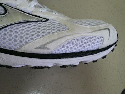 我腳掌較寬, 穿的是寬楦板, 鞋楦頭的舒適性不錯, 採用mizuno路跑用楦頭, 有別於一般膠皮, 是類似布面的材質, 較柔軟, 彎曲性佳, 不會有卡腳趾的感覺, 不過如果下雨的話也很容易濕透.